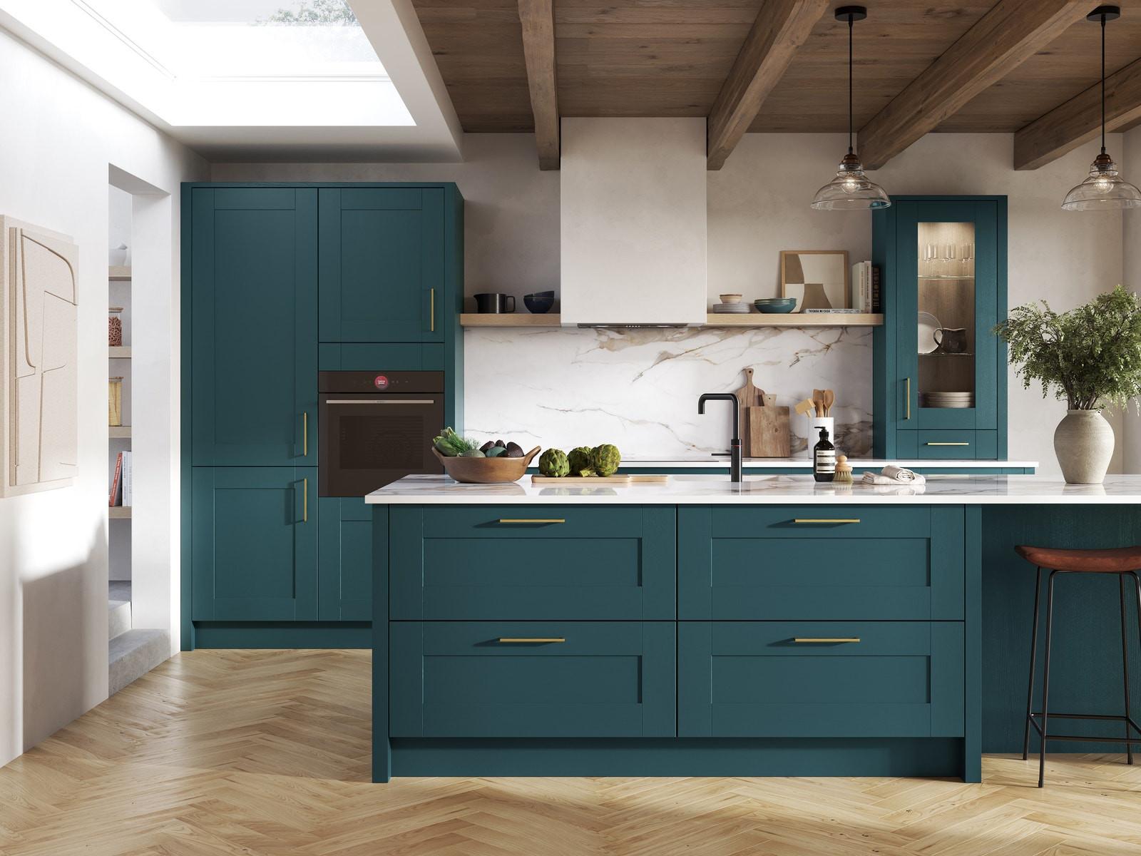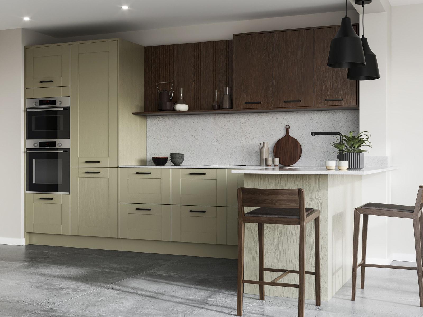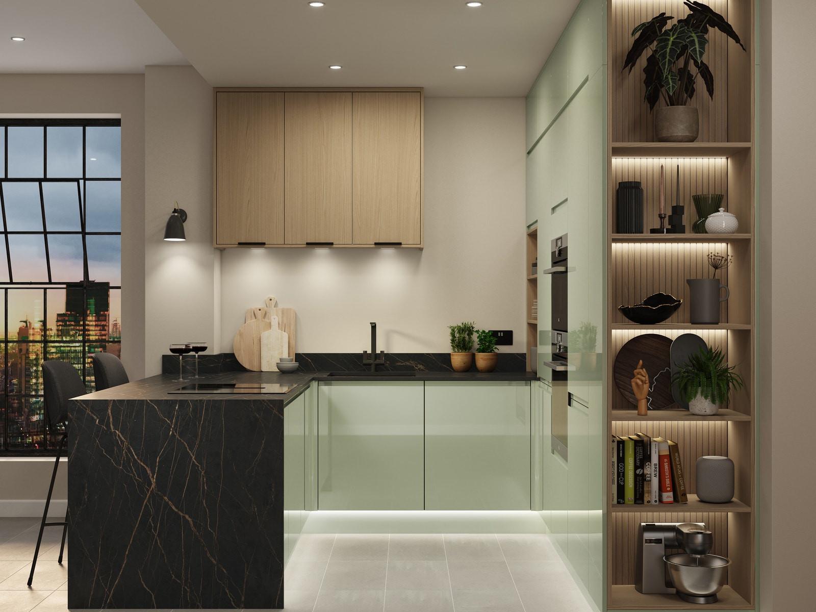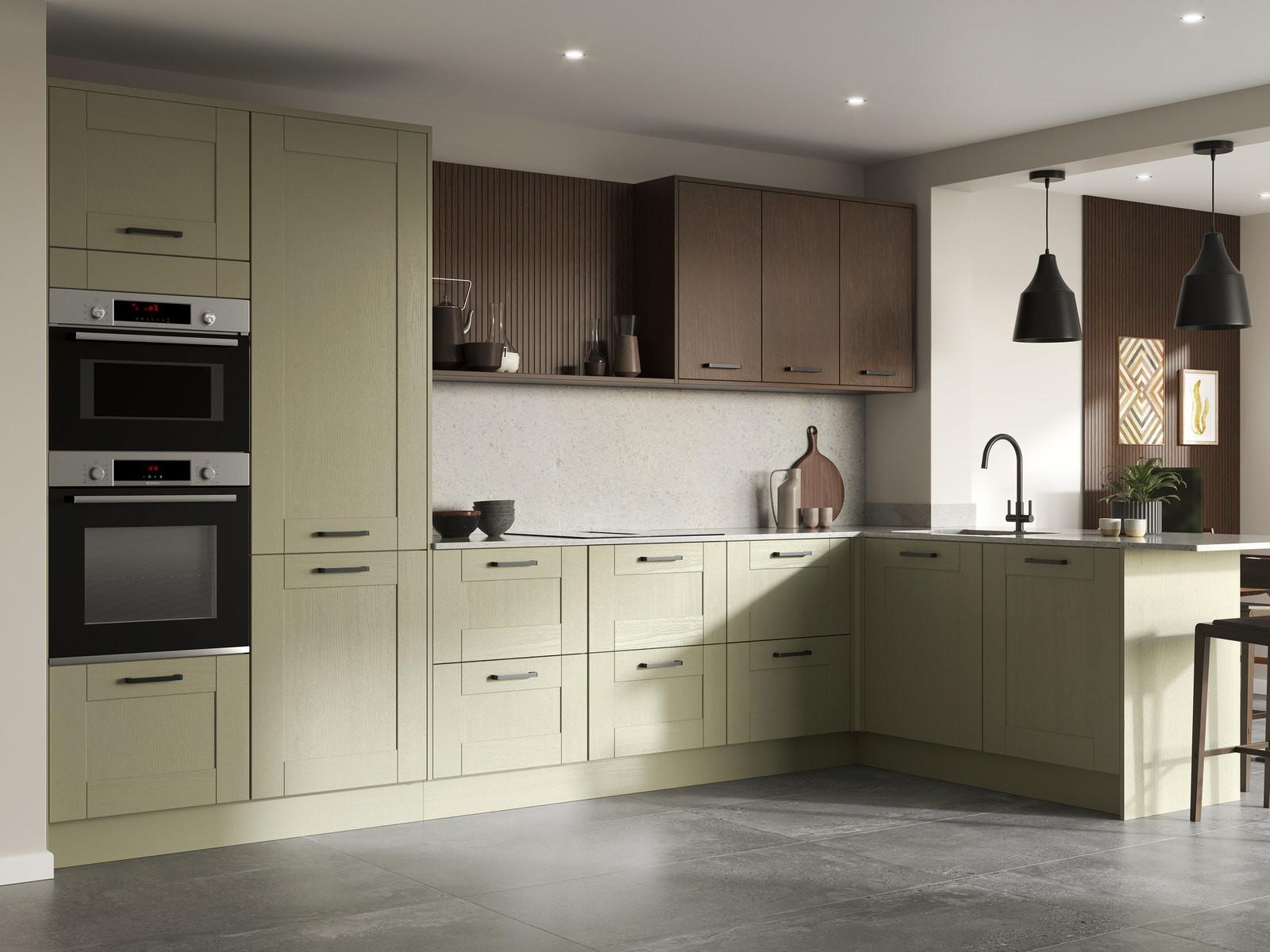 The high gloss lacquered Sofia range offers a sleek, minimalist, streamlined look with its integrated J-pull handles. This clean, bright design is softened by the fresh reed green colourway, in a combination which is utterly contemporary.