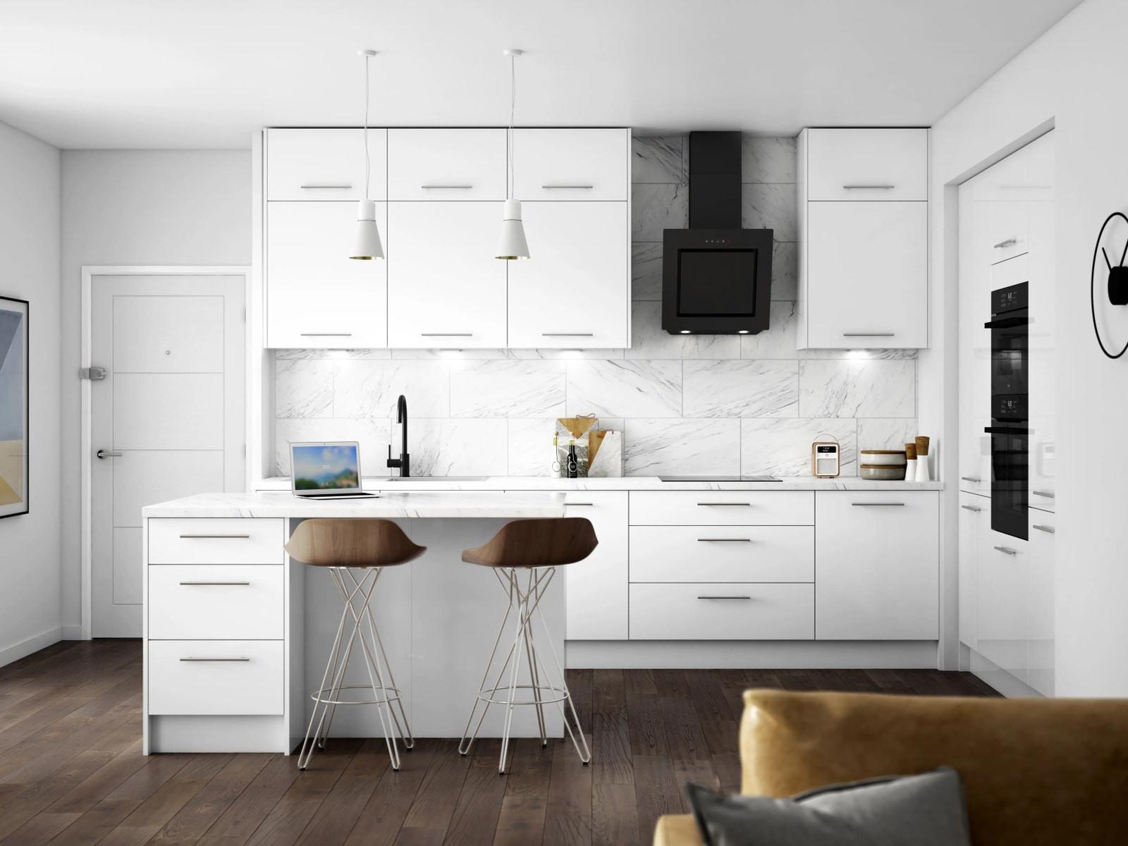 For a bright, uncluttered kitchen, the smooth glossy lines of Orlando White fit the bill. Featuring a stylish, modern, bar handle for a contemporary feel.